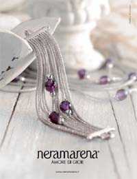 Il protagonista della campagna è comunque uno dei gioielli di punta Neramarena: il bracciale con fili di argento impreziositi da elementi in agata viola, fotografato su un pregiato mobile bianco decapato, dal mood vagamente shabby. Sullo sfondo si intravede la collana da abbinare. Il bracciale fa parte della Linea Petra, ed è appunto elemento di una parure di grande pregio composta da una scenografica e preziosa collana lunga e da eleganti orecchini arricchiti sempre dall’agata viola.