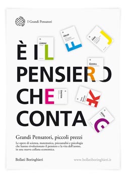 'Quello che conta è il pensiero' è il claim scelto da Catoni Associati per il lancio della collana economica 'I Grandi Pensatori', una selezione delle opere di scienza, matematica, psicoanalisi e psicologia. Sulla cover dallo sfondo bianco spiccano grandi lettere colorate che rappresentano gli autori. Per ogni firma è proposto un colore fluo diverso e così Freud diventa una grande F azzurra, mentre Einstein è una E di colore fucsia.