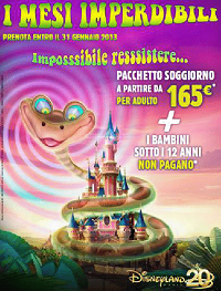 Durante le festività natalizie parte la nuova campagna media di Disneyland Paris in collaborazione con Alpitour Distributore Ufficiale, incentrata sulla promozione 'I mesi imperdibili'. L’offerta, caratterizzata da un prix d’appel molto vantaggioso, è supportata da una campagna media nazionale che integra tv e web.Dal 23 dicembre al 12 gennaio sono on air gli spot di 20” e 30” sui canali free e digitali di Mediaset, sui canali tematici di Sky, su Discovery e K2. Lo spot è incentrato su Kaa il pitone incantatore del film Disney 'Il libro della giungla' che invita adulti e piccini a non perdere i grandi festeggiamenti per il 20° Anniversario di Disneyland Paris, ad un prezzo davvero molto conveniente.