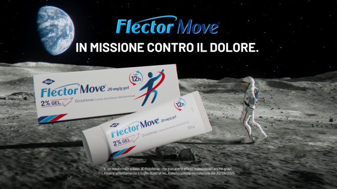 Ideato da VML Italy, che ha curato anche il naming del prodotto, e prodotto da Skipless/ Movie Magic International con la regia di Gigi Cassano, lo spot rappresenta il terzo capitolo della campagna Flector ambientata nello spazio. Dopo la stazione orbitante e l’esterno della navicella, questa volta la scena si sposta sulla superficie lunare, dove un astronauta, durante una missione di esplorazione, avverte un improvviso dolore al ginocchio. Per fortuna la sua collega è pronta a offrirgli una confezione del nuovo nato in famiglia Flector. E mentre il computer di bordo – voce ricorrente dell’intera saga – descrive le caratteristiche e le proprietà del nuovo prodotto, il dolore svanisce e il protagonista può finalmente tornare a muoversi liberamente, concedendosi anche un divertente ballo a gravità ridotta.