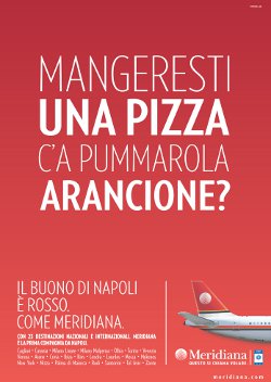 Un messaggio diretto. La voglia di affermare una leadership territoriale, ma anche l’amore e la vicinanza a una città come Napoli, che per Meridiana è un autentico trampolino per il mondo. La campagna stampa in uscita su 'Il Mattino' di Napoli edizione nazionale, sfrutta tutta la forza del copy ad per veicolare un concept ironico e tagliente: le cose buone, e 'vere', di Napoli sono rosse. E non potrebbero mai avere altri colori.Proprio come la pummarola per fare la pizza: una tradizione che da secoli vola sulle tavole di tutto il mondo, una leggenda che lega a doppio filo la città e la sua storia.