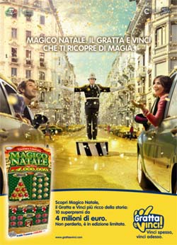 Un nuovo biglietto dall’atmosfera magica entra a far parte della famiglia Gratta e Vinci: Magico Natale. Il lancio, a cura di Y&R Roma, è su stampa quotidiana e periodica, su affissione nelle Grandi Stazioni e coinvolgerà anche i Taxi di Milano, Roma e le altre maggiori città italiane.Il lancio della campagna sarà anticipato dai teaser, dove vedremo alcuni particolari ricoperti da una misteriosa 'nevicata'.