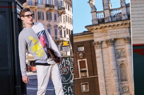 Un collage di frammenti cittadini dove i capi della collezione si inseriscono come elementi di contrasto.