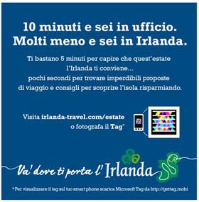 Nel mese di Luglio, sulle testate Leggo, City, Metro ed altre, in distribuzione nelle città di Milano e Roma, fotografando il tag i possessori di uno smart phone, potranno raggiungere rapidamente la pagina delle offerte speciali del sito istituzionale Turismo Irlandese.