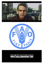 Si chiama '1billionhungry' il nuovo progetto della FAO realizzato in collaborazione con Filmmaster e McCann Erickson, una nuova campagna di sensibilizzazione contro la fame nel mondo, con l'obiettivo di creare un movimento mondiale che lotti affinché tutti abbiano accesso ad un’alimentazione adeguata. Uno spot tv di grande impatto che vede protagonista il premio Oscar Jeremy Irons che urla al mondo la sua indignazione. Lo spot ha l'obiettivo di raccogliere 1 mln di firme da consegnare il prossimo ottobre all'Onu in occasione del World Food Day, con lo scopo di sensibilizzare i governi a prendere provvedimenti contro la fame, datoche ancora oggi 1 miliardo di persone non ha sufficienti risorse per sfamarsi. La campagna sarà pianificata anche in affissioni, stampa, web, merchandising, guerrilla e pr.