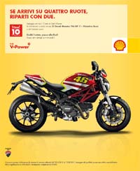 Promozione tutta estiva, quella firmata Shell: a fronte dell’acquisto dei carburanti Shell V-Power, i clienti potranno ottenere in omaggio un gadget dal kit da spiaggia: materassino, pallone e racchettoni firmati Shell V-Power.Non solo, si potrà inoltre partecipare al concorso che mette in palio 10 Ducati Monster 796 GP11 -Valentino Rossi che, come Shell, condivide la stessa passione per l’eccellenza nella