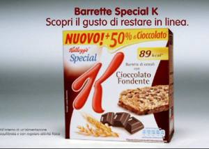 Kellogg presenta le nuove barrette Special K con Cioccolato Fondente, da oggi con il 50% di cioccolato in più rispetto alla formula precedente, ma sempre meno di 90 calorie per porzione. Uno snack gustoso, fatto di croccanti petali di cereali Special K con una base di cioccolato fondente e golose gocce sulla superficie. Per chi desidera restare in linea 'il cioccolato diventa un miraggio', come narra il nuovo spot ideato da JWT on air a partire da domenica 25 aprile.