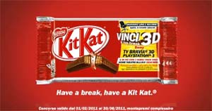 La campagna di comunicazione integrata, ideata e realizzata da JWT/RMG Connect è stata declinata su diversi punti di contatto: la promo on pack (“Vinci il tuo Break 3D”) e l’attività in store dedicate al mondo del 3D marchiato Sony. Acquistando infatti una confezione di Kit Kat si può giocare il codice sul sito www.kitkat.it o via sms e vincere così una PlayStation 3 o un TV Sony BRAVIA 3D. Acquistando due confezioni di Kit Kat family, si può vincere inoltre un Home Theatre Blu- Ray.On air dal 20 febbraio la televisione, con tre divertenti video che sono anche online sul sito web istituzionale kitkat.it, oltre che su YouTube, Facebook e con campagna banner.