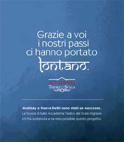 La campagna stampa, pianificata localmente sui quotidiani indiani, è stata declinata anche su affissioni e comunicazione btl. A rimarcare il successo dell’evento, in Italia è uscito, su stampa specializzata, un annuncio di ringraziamento per chi ha sostenuto la Scuola di ballo. Le due operazioni sono firmate dalla copy Elisa Zugno e dall'art Gabriele Ruscelli.