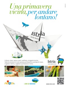 L'headline 'Una primavera vicina, per andare lontano' racchiude in sè la promessa di una meta vicina, dove la vicinanza non è solo una categoria geografica ma anche culturale. L'Istria, infatti, è una regione della Croazia che offre tante possibilità di soddisfare il turista italiano: dal mare cristallino ai piaceri dell'enogastronomia, dal turismo culturale al quello attivo all'insegna dello sport. Insomma un concentrato di emozioni a portata di mano e -last but not least- con un rapporto qualità/prezzo allettante.