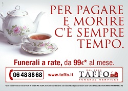 Dopo il clamore mediatico della campagna sulla cremazione diamond, Taffo Funeral Services torna in affissione a Roma dal 20 aprile con una campagna sui funerali a rate, ideata da Peyote adv e pianificata in esclusiva da Clear Channel. Il messaggio è come al solito ironico, stavolta però il compito creativo di rendere memorabile la campagna è affidato ad un famoso proverbio, 'Per pagare e morire c'è sempre tempo', funerali a rate da 99 euro al mese. Si chiude così una sorta di trilogia sull'argomento, sempre ad inizio anno, iniziato nel 2012 con 'Perché piangere due volte?' e proseguito nel 2014 con