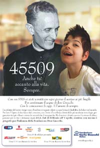 '45509: anche tu accanto alla vita, sempre. Con un sms ci aiuti a restituire ogni giorno il sorriso ai più fragili'. È il tema della campagna di raccolta fondi tramite sms solidale della Fondazione Don Gnocchi a sostegno di un progetto per l'utilizzo dei più avanzati sistemi tecnologici di realtà virtuale per la riabilitazione neuromotoria dei bambini con disabilità.La campagna, avviata lo scorso 26 febbraio, proseguirà fino al prossimo 1° aprile e si declina sia online (banner e DEM on-line), che offline (pagina stampa e spot tv e radiofonico).