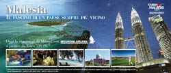 E’ partita i primi di ottobre la campagna tattica dell’Ente del Turismo della Malesia pianificata in collaborazione con Singapore Airlines e SEA. In particolare, l’operazione prevede maxi affissioni per tutto il mese di ottobre nei due aeroporti di Linate e Malpensa nell’area check-in e partenze con una creatività volta ad attirare i viaggiatori a scoprire la Malesia volando a bordo della flotta di Singapore Airlines che collega comodamente l’Italia con la Malesia con partenze quotidiane da Milano Malpensa e Roma Fiumicino a tariffe vantaggiose (a partire da € 599,00 tasse incluse). Oltre alle affissioni, la campagna prevede anche passaggi radio su RTL 102.5, trasportando gli ascoltatori in un viaggio ad occhi aperti. Lo spot di 20 secondi molto evocativo - in fascia rotazione per 6 giorni dalle 5.00 all’1.00 di notte -, introduce nella terra della Malesia, dove il sorriso accogliente della sua gente, un incontro unico e armonioso tra diverse culture e tradizioni, è pronto ad accogliere il turista tra moschee, tempi indù, costruzioni iper moderne come le Torri Petronas e i mall con un’offerta di store dei brand internazionali più famosi affiancati a stilisti e artigiani locali. Il tutto affacciato su spiagge bianche e mare cristallino.