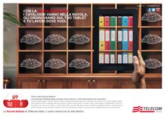 mobilità. Con questa offerta i cataloghi vengono digitalizzati, quindi l’idea creativa mostra dei polverosi folder di un ufficio sostituiti dalla leggerezza della Nuvola. Inoltre il tablet, protagonista del layout, rende ancora più chiaro il funzionamento dell’offerta evidenziando il concetto di vicinanza. “Con la Nuvola Italiana i cataloghi vanno nella Nuvola, gli ordini vanno sul Tablet e tu lavori dove vuoi”Una terza creatività è dedicata a l’offerta Nuvola It Data Space che rientra nella categoria delle piattaforme IaaS per l’erogazione di spazio storage come servizio, per