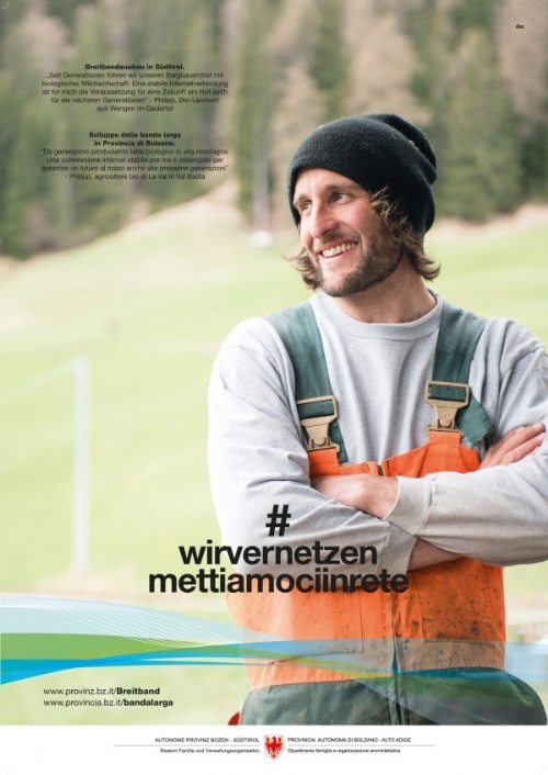 Al via la campagna di informazione promossa dalla Provincia autonoma di Bolzano e firmata dallo studio sudtirolese doc Office for Communication and Design per sensibilizzare l'opinione pubblica sullo sviluppo della banda larga in Alto Adige. Previste affissioni lungo le strade di paesi, vallate e città, una campagna digitale e attività social.