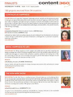 Questa sezione è quella in cui sono stati più numerosi i progetti pervenuti, 180 da 34 Paesi, proposti da aziende di varia tipologia e dimensione. Il progetto Labmedia 'Contagious Happiness' è arrivato in finale insieme a quello dei produttori californiani Atlantic Studios, 'Bring Happiness to Life', e ai distributori inglesi Scorpion Tv con 'The win-win Show'. Quest’ultimo, definito una sorta di ''The apprentice’ con l’anima', è risultato vincitore, e si è aggiudicato il contratto di sviluppo di 10.000 euro, ma Ogilvy si è riservata un diritto di opzione di 6 mesi anche sugli altri 2 finalisti.