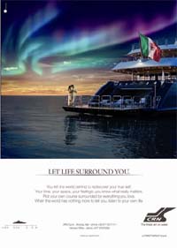 La nuova campagna si focalizza sulla loro sfera emozionale, sul loro desiderio di circondarsi di cose che rappresentano le loro passioni, i loro sentimenti e i loro affetti; scegliere CRN per vivere in modo esclusivo il mare e condividere emozioni e sensazioni uniche. La romantica coppia che si gode l’aurora boreale sul beach club a poppa della nave, elemento esclusivo ed inconfondibile delle imbarcazioni del cantiere di Ancona, vuole comunicare che in qualunque remoto angolo del mondo uno yacht CRN dà la possibilità di vivere esperienze uniche circondati dall’unico vero lusso: le proprie emozioni.