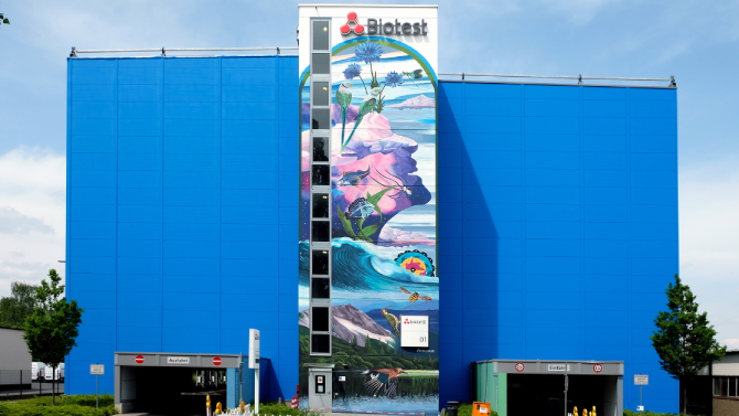 "Parallelamente abbiamo coinvolto l’artista Iena Cruz che, da sempre, cerca con la sua arte di sensibilizzare sul rispetto ambientale e sulla protezione delle specie in via di estinzione e che ha dipinto un’opera di oltre 100 mq sulla parete della sede tedesca di Biotest AG usando 350 litri pittura anti-inquinamento che ridurrà l’impatto ambientale dell’intero stabile, assorbendo la stessa quantità di Co2 di 100 alberi in un anno. Alla base di Linfa, così è stato chiamato il mulare, il concetto di biofilia che potremmo riassumere come la connessione tra vari elementi (flora, fauna ed essere umani) e che, da sempre, è alla base delle attività di Biotest”, conclude Nebuloni.