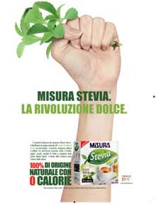 Dopo una prima tranche di “assaggio” pianificata nello scorso dicembre, parte definitivamente la Rivoluzione Dolce, con il lancio del dolcificante Misura Stevia, il primo di origine completamente naturale, con 0 calorie. Una rivoluzione con tanto di pugno chiuso, quello di una donna che stringe una piantina di Stevia , per rappresentare il cambiamento radicale in arrivo nel mondo dei dolcificanti.La Stevia è una pianta che cresce in Paraguay, ed è conosciuta da secoli dagli indios locali come un dono della natura pieno di virtù terapeutiche, ma soprattutto come la “dulce planta” che può sostituire in tutto e per tutto lo zucchero, senza i difetti dello zucchero: le calorie e tutto il resto.