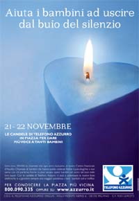 Una candela speciale il cui ricavato, come recita l'head line dell'annuncio 'Aiuta i bambini ad uscire dal buio del silenzio', contribuirà a sostenere e potenziare le Linee di Ascolto 19696 e 199.15.15.15. le linee telefoniche dedicate ai bambini maltrattati che, grazie ai volontari di Telefono Azzurro, sono ascoltati e aiutati concretamente.