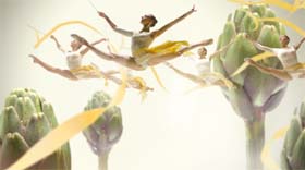 I nastri di seta delle atlete si trasformano in eleganti nastri di pasta, che tra salti performance avvolgono enormi verdure e pesci di un mondo immaginifico, fino a racchiuderli completamente e dare vita ai ravioli. “Ripieni di benessere” è il claim che chiude i due soggetti, realizzati nei tagli 5",10" e 30" per entrambi, e nel taglio 45" per Gioiaverde. Molto di impatto anche la decordinamica sull’ Eurotram di Milano, che vede le protagoniste avvolgere le verdure con i loro nastri di pasta.