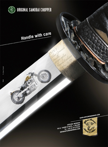 Periodici di settore e mensili generici ospitano in questi giorni la campagna di lancio delle samurai chopper realizzate dalla zero Engineering e distribuite in esclusiva per l’italia da Officine Mermaid. Direzione creativa di luca del Bono e Rocco Fainardi. Foto di gianni Rizzotti.