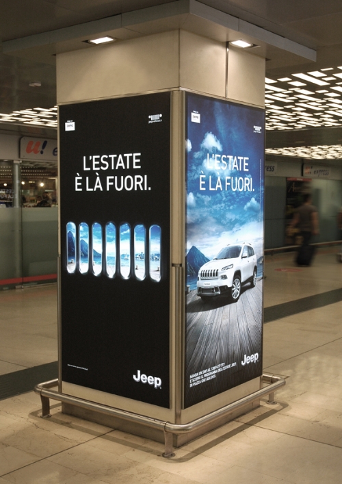 L’intero spazio è stato allestito con immagini di paesaggi memorabili resi ancora più esclusivi dal trattamento scelto per mostrarli. Tutti i luoghi vengono infatti visti in un modo davvero inedito: dall’interno di una vettura Jeep, attraverso l’iconica griglia a sette feritoie. La griglia diventa così il leit motiv dell’intera campagna di comunicazione declinata anche su stampa con più soggetti dedicati ai singoli modelli, e outdoor, e retta dal claim: 'L’estate è là fuori'. Executive Creative Director: Alessandro Antonini, Francesco Bozza.