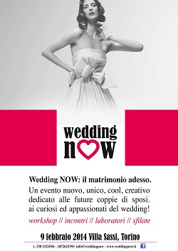 E' firmata da Les Moustaches Adv la comunicazione istituzionale e web di Wedding Now, il nuovo format dedicato agli sposi e al mondo del wedding, in programma a Torino il 9 febbraio 2014, creato in collaborazione con Fabiana Pagliardi e Nozze Eventi What a Passion. La creatività è stata realizzata dalla coppia creativa Adriano Dettori ed Elisa Perotti. Campagna stampa, affissioni e social media editing compongono la strategia di comunicazione.Pianificazione su stampa quotidiana e web a cura del cliente.