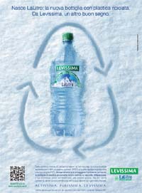 Levissima è on air dal 2 febbraio con una campagna stampa firmata da Lowe Pirella Fronzoni dedicata alla LaLitro, la prima bottiglia di acqua minerale naturale da 1L realizzata con il 25% di Pet riciclato (R-PET) che permette così alla plastica di rivivere trasformandosi in altre bottiglie di plastica.Per sottolineare l’impegno di Levissima e di tutto il Gruppo Sanpellegrino nei confronti dell’ambiente e l’importanza del lancio di questa innovativa bottiglia, la campagna stampa, pianificata sui principali quotidiani nazionali e periodici, è interamente incentrata sul tema del Riciclo: protagonista della scena è la nuova bottiglia LaLitro immersa in un manto di neve, che richiama l’origine incontaminata dell’acqua Levissima, e racchiusa, come in un abbraccio, dall’icona del riciclo.