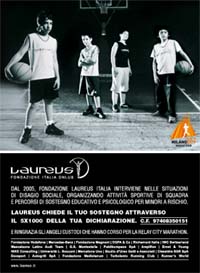Nei giorni scorsi, in occasione della partecipazione di Laureus alla Milano City Marathon, è uscito un annuncio sulla Gazzetta dello Sport per chiedere, come dice Alberto Tivoli, amministratore delegato dell’agenzia: "Che tutti quelli che credono nello sport come una delle più pure attività umane e sanno che la partecipazione agli sport di squadra possa risolvere le situazioni di malessere e disagio giovanile, aiutino Laureus donando il 5x1000 della propria dichiarazione al C.F.97408350151. Laureus, con cui collaboriamo con immenso piacere, è un’altra delle attività pro bono, insieme a quelle per Pubblicità Progresso e Telefono Azzurro, che pianifichiamo in agenzia per ricordarci che non è solo il lavoro e il profitto che ci guida, ma anche il fatto che viviamo tutti insieme su un solo pianeta".