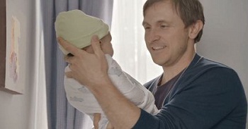 Le complessità realistiche del fasciare un neonato vengono raccontate in modo soft con una demo delle funzioni innovative del Galaxy S4, tra cui la possibilità di rispondere alle chiamate con un cenno della mano e la pausa automatica quando si toglie lo sguardo.