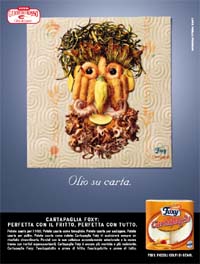 Nel secondo, su un foglio di cartapaglia è adagiato un invitante fritto misto. Ma ad uno sguardo più attento, ci si accorge che zucchine, gamberi e polipetti danno forma ad un volto, con un’ironica allusione alle opere dell’Arcimboldo. In questo caso, il titolo ovviamente recita: 'Olio su carta'.Parallelamente è stata sviluppata una campagna stampa anche per il concorso 'Foxy ti regala Tuttifritti', che mette in palio il libro 'Tuttifritti', curato dal Gambero Rosso, per scoprire i segreti di un fritto perfetto.