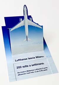Inizialmente la cartolina svela solo la prima parte del messaggio, 'Lufthansa lascia Milano', quasi a confermare l’addio della compagnia tedesca al capoluogo lombardo. Ma poi, tirando la linguetta che fa sollevare l’aeroplano, l’informazione viene completata - e ribaltata - con il numero dei voli Lufthansa che decollano ogni settimana da Milano.