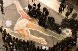 La figura finale della rovesciata, il simbolo dell’Album Calciatori Panini, è stata composta dallo street artist Marco Teatro come in un gran mosaico formato da decine di migliaia di figurine in una dimensione reale di 10 metri per 7.