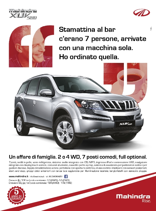 Il piano di comunicazione dedicato inizialmente al modello XUV 500 e alla gamma GOA, ruota attorno al concetto di 'rise' , un'idea di miglioramento e superamento del concetto dei limiti, e sarà declinato su periodici del settore automotive e specializzati e sul web. Pianifica Initiative.