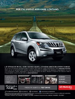 Il Gruppo Mahindra, una delle maggiori imprese indiane operanti nel settore automobilistico, sceglie Draftfcb Milano e Initiative per sviluppare la campagna di lancio del nuovo modello Mahindra XUV500.'Per chi vuole arrivare lontano' è il claim della campagna stampa, che mostra una foto dell’auto all’interno di un paesaggio extra-urbano, la cui lunga strada asfaltata si perde all’orizzonte.