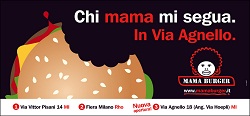Mama Burger, conosciuta catena milanese di high quality fast food, si affida nuovamente a RGGT Partners, agenzia creativa guidata da Giulio Raspagliesi e Gianluca Traversi, per la campagna pubblicitaria con maxi affissioni per il lancio del nuovo Mama Burger (il terzo a Milano) aperto recentemente in Via Agnello 18, cuore pulsante del capoluogo meneghino.Due sono gli obiettivi che si propongono i titolari di Mama Burger Guido Cancellieri e Stefano Graziani: lanciare il terzo punto vendita della catena e sottolineare i punti di forza degli hamburger: alta qualità e grandi dimensioni. Ecco così che nascono gli slogan della campagna di advertising sviluppata a doppio soggetto su stampa e maxi affissione: 'Chi mama mi segua. In Via Agnello', un libero omaggio alla famosa campagna Jesus in memoria di Emanuele Pirella, uno dei più grandi maestri della comunicazione nazionale ed internazionale, e 'Tanti morsi. Nessun Rimorso', un semplice gioco semantico per sottolineare la più grande dimensione dei panini di Mama Burger e il loro spiccato valore appagante.