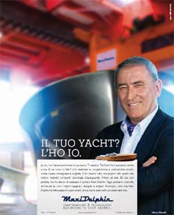 'Il tuo yacht? L’ho io', è la frase pronunciata da Moretti, per la prima volta sponsor per la campagna pubblicitaria di una sua attività. È una head line molto coinvolgente che pone il lettore nella posizione di interlocutore diretto con il cantiere e con chi lo rappresenta, la stessa posizione che ricopre ogni cliente di Maxi Dolphin.