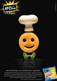 ad elementi semplici e naturali, come le verdure fresche, per creare accostamenti di idee divertenti e sorprendere come sempre i suoi consumatori con immediatezza, spontaneità e originalità. La campagna stampa sarà veicolata sulle più importanti testate periodiche nazionali tra gennaio e maggio 2010 e verrà affiancata da un’attività sul web che riserverà ulteriori sorprese a tutti i consumatori che visiteranno il sito internet www.mccain.it.La pianificazione stampa è parte di una strategia di comunicazione integrata, frutto dell’attenzione alle nuove tendenze di consumo e in grado di catturare l’attenzione del consumatore a 360 gradi. Questo grazie ad azioni rivolte sia al mondo editoriale che a quello virtuale e ad attività mirate sul punto vendita. Si consolida così l’immagine aziendale e la mission di McCain: dare più valore al gusto, con un mondo di idee tutte da scoprire.