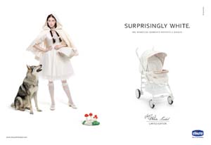 Si tratta di una curiosa incursione del colore bianco, o meglio del 'surprisingly white' come recita il pay off, nel mondo dei bambini e nel personaggio di Capuccetto Rosso, rivisitato in chiave fashion. La comunicazione studiata da McCann Erickson segue quella di Trio Living Black (lanciato l’anno passato con una Binacaneve nera) rinnovando il suo stile contemporaneo, senza perdere di vista le caratteristiche che da sempre fanno di Chicco il brand più rappresentativo del mondo del bambino.