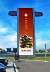 Per ottimizzare la sua comunicazione esterna, che quest’anno sarà particolarmente dinamica, l’azienda distributrice del brand Merrell, ha deciso di pianificare in esterna con Clear Channel nelle autostrade, oltre ai poster 6x3 e gli impianti 'Y' 4x3, anche il circuito nazionale di 42 “Joint” di 3x6, con due lanci a copertura nazionale della durata di 14 gg., dove la 'verticalità' assume il ruolo di nuovo linguaggio comunicazionale.