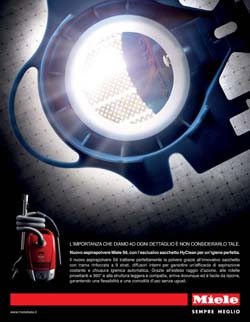 Miele torna in scena con una campagna stampa multi-soggetto, sulle principali testate femminili e di arredamento. L’esaltazione del dettaglio, espressa tramite la valorizzazione dei particolari che fanno la differenza, riafferma Miele come un brand di qualità. L’headline della campagna, infatti, afferma: 'L’importanza che diamo ad ogni dettaglio è non considerarlo tale'.L’obiettivo è quello di evidenziare le qualità del prodotto rivolto al raggiungimento di performance che rispondono alle esigenze di un cliente sempre più attento ed evoluto.