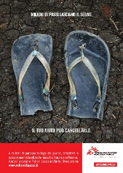 Un concetto capace di legare fra loro i passi delle vittime ai passi degli operatori sanitari dell’organizzazione e infine ai passi che la campagna chiede di fare ai potenziali donatori per aderire alla mobilitazione; e che troverà un fortissimo supporto emotivo nelle foto delle martoriate calzature di fortuna indossate dai profughi realizzate dalla fotoreporter americana Shannon Jansen, che costituiranno il raccordo visivo dell’intera operazione anche nello spot affidato alla regia di Luca Lucini (CdP Filmmaster/executive producer Fabrizio Razza) con la voce fuori campo di Francesco Prando.