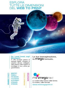 Il visual firmato da ADF&R introduce la figura di un astronauta, voce narrante anche delle prossime campagne, che muovendosi nello spazio - inteso come elemento rappresentativo delle infinite possibilità offerte da Minimegaprint - punta la sua attenzione su tre satelliti, reinterpretazione grafica del logo aziendale.Per permettere riconoscibilità della categoria di prodotto proposta nelle diverse campagne dedicate ai differenti stampati di Minimegaprint, il trattamento cromatico sia del lettering che del visual è declinato nei tre colori che richiamano il brand ed esemplificano le tre macro aree di attività: blu per il grande formato, giallo/ocra per il piccolo formato e fucsia per gli espositori.