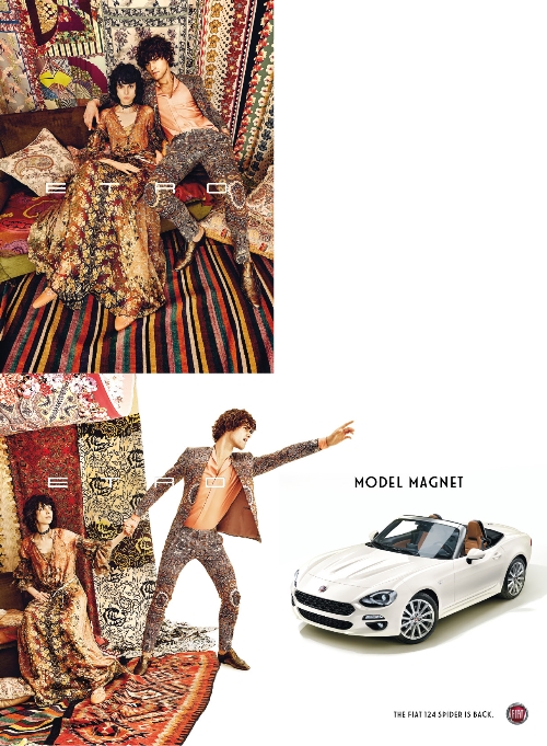 La doppia pagina, a seguire, coniuga la creatività del fashion brand con la Fiat 124 Spider. Ad unire i due mondi è l’azione svolta dai modelli legati al fashion brand, impegnati in un’interazione e un’attrazione con la Fiat 124 Spider: un impianto creativo basato sul nome stesso della campagna, “Model Magnet”, sul concetto di attrazione tra due realtà iconiche e con un forte posizionamento stilistico.