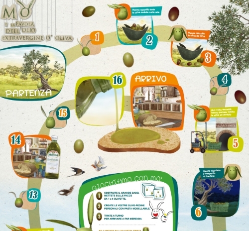 Una campagna di educazione alimentare che ha come protagonista un simpatico personaggio di nome Mo’, una olivetta con tanto di foglioline, pronta a fare da guida ai bambini nel percorso dall’uliveto al frantoio fino alla tavola, mostrando in maniera giocosa quali sono le tappe che portano dall’oliva al prezioso liquido verde che ogni giorno arricchisce di bontà e salute i piatti preparati da scuole e famiglie.