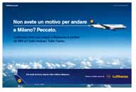 È MRM Worldwide Italia, la Digital Thinking Agency del gruppo internazionale IPG, guidata da Michele Sternai, l’agenzia che ha ideato la campagna di lancio delle nuove offerte di Lufthansa Italia (divisione di Lufthansa operativa da febbraio 2009 in Italia) sotto la direzione creativa esecutiva di Alex Brunori, con l’art director Giuliano Bellini e i copywriter Daniela Calvanico ed Enrico Cibelli.La campagna, finalizzata a creare awareness sulla struttura e sul network della nuova divisione, presenta tre soggetti: uno relativo a offerte nazionali e internazionali per l’aera di Milano, uno per offerte nazionali per le aeree di Roma, Napoli e Bari e un terzo soggetto per comunicare una promozione rivolta alle famiglie. La campagna è declinata sui principali portali e siti news italiani da Profero | PLAN.NET sotto la supervisione dell’art director Ilaria del Ponte e la web designer Paola Ferri.