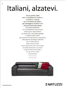Con una speciale campagna di comunicazione ideata da Bcube, Natuzzi festeggia i 150 anni dell’unità d’Italia. Con il claim 'Italiani, alzatevi' non viene chiesto di sedersi comodamente su un divano Natuzzi ma, al contrario, di alzarsi e manifestare tutto l’amore per il bel Paese.Così come ha fatto la Natuzzi con oltre 50 anni di storia esportando nel mondo i valori che l’hanno contraddistinta e resa celebre: la passione, il design, l’attento lavoro artigianale svolto in aziende italiane nel rispetto per l’ambiente e con controlli in tutte le fasi di produzione.