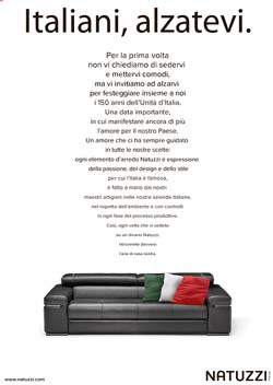 Natuzzi, l'azienda italiana di arredamento, festeggia i 150 anni dell’Unità d’Italia con una campagna di comunicazione.'Italiani, alzatevi' è il claim di campagna. Questa volta non viene chiesto agli italiani di mettersi comodi ma, al contrario, di alzarsi per manifestare tutto l’amore per l’Italia.