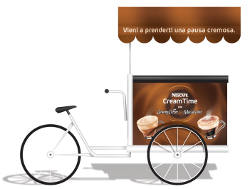 Si chiama 'Nescafé Cream Time' ed è la nuova iniziativa promozionale proposta da Nescafé, per la prima volta, attraverso un curioso bar in dimensioni ridotte e su tre ruote. Gli obiettivi principali delle attività sono raggiungere e incontrare in maniera diretta i propri consumatori nella loro quotidianità cittadina. In programma, 1428 degustazioni al giorno di cui 180 all’ora.Tra il 2 ottobre e il 15 novembre, in 10 città italiane, tra cui Roma, Milano, Torino e Bologna, due bici-bar saranno presenti in diverse aree per offrire a tutti gli appassionati del caffè Nescafé la possibilità di degustare gratuitamente un Ginseng Coffee o un Mocaccino. Diverse le azioni a supporto del progetto: dall’offerta di buoni sconto da 0,50 € per l’acquisto di uno dei 2 prodotti alla distribuzione di sampling e leaflet presentati con una grafica che evoca gli ingredienti e il gusto delle bevande Nescafé.